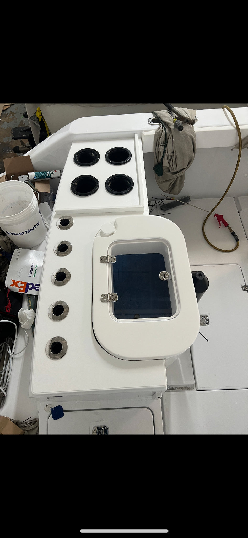 Optional Accessories: Pictured with Optional Stripe and Window, Leaning Post,Full Sized lid, cup holder and custom rod rack with gaff holder